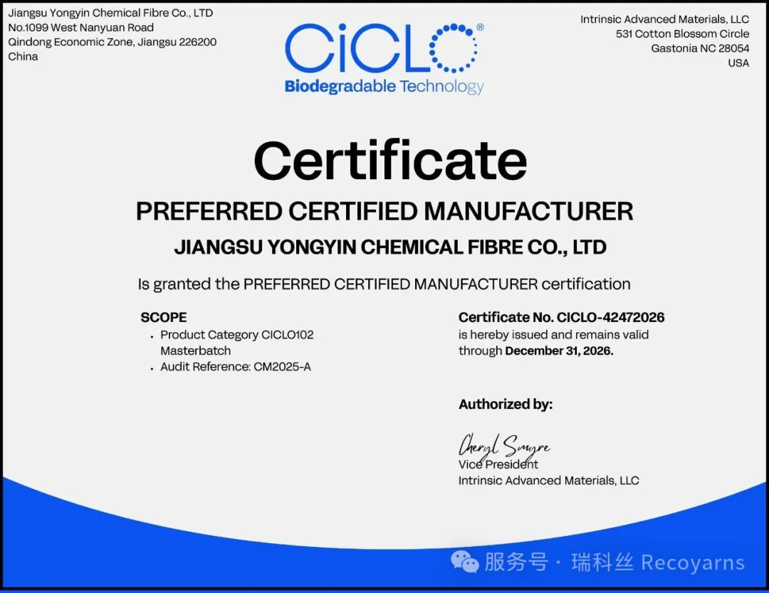 重磅喜訊!江蘇永銀化纖榮膺 CiCLO 可降解技術(shù) 2026 年度優(yōu)選認(rèn)證制造商